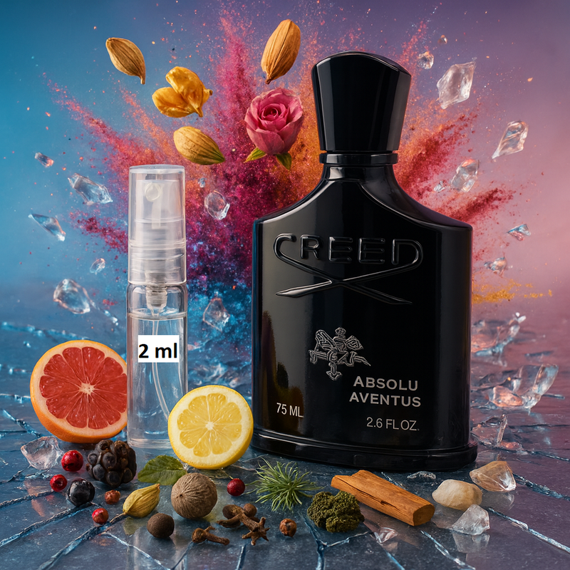 Absolu Aventus is a masterfully structured fragrance with distinct top, middle, and base notes. The top notes include grapefruit, bergamot, pink pepper, black currant, pineapple, nutmeg, and cloves, creating a fresh, spicy, and slightly fruity opening. Heart notes of ginger, cinnamon, citron, cardamom, and rose add warmth, complexity, and elegance. The base notes—patchouli, vetiver, oakmoss, ambroxan, sandalwood, musk, tonka, and evernyl—provide a rich, enduring foundation that lingers throughout the day. This multi-layered composition allows the fragrance to evolve beautifully, offering a different experience at each stage. Sampling it through our mini bottles helps you explore all these nuances on your skin before choosing your preferred size.